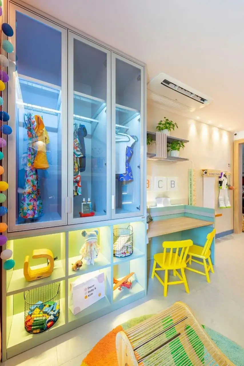 Para fazer este sonho acontecer, a Criare Abel Cabral foi a responsável por projetar os móveis que moldam todo o espaço, contando com uma cama beliche feita sob medida, tablado para brincadeiras, espaço de guarda-roupa e mesa evolutiva, que vai acompanhando o crescimento da criança e pode ser adaptada para ser usada em todas as idades.