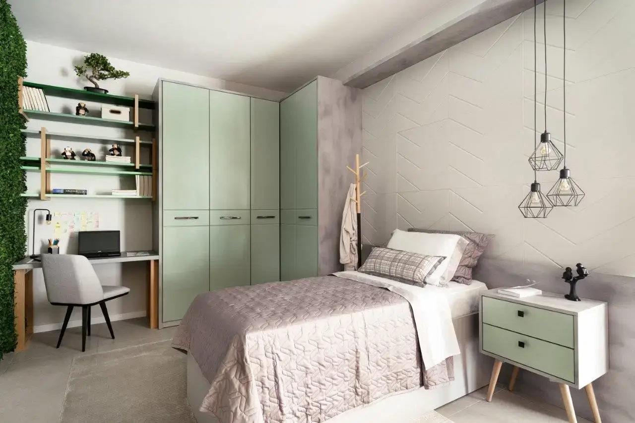- Clean e aconchegante, o quarto de solteiro assinado pela Criare D'Rosa Home, em Criciúma, traz uma pequena mesa de trabalho com prateleiras para organizar livros, caixas e demais objetos. Detalhe para a tonalidade verde clara do padrão Fresh, que transmite sensação de bem-estar e tranquilidade. Foto: Roberta Gewehr