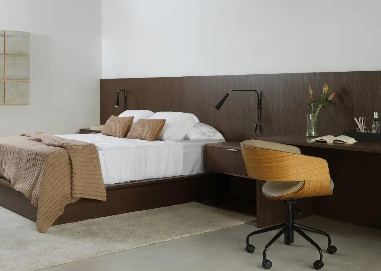 - No projeto assinado pela arquiteta Ticiane Lima para a Criare Perdizes, a bancada segue o mesmo padrão amadeirado Nocê Sevilha na cabeceira e na cama de casal, de forma inteligente e minimalista. Foto: Marco Antônio