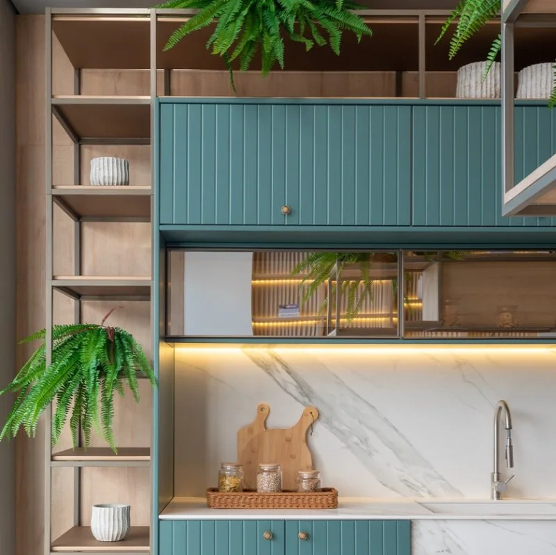 - Vidro: o vidro é frequentemente usado em mesas e detalhes de armários. Ele cria uma sensação de abertura e leveza, além de ser fácil de limpar e manter.