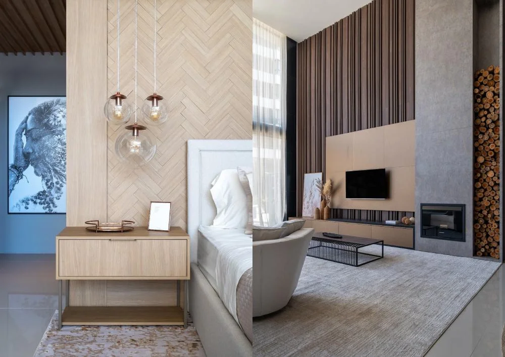 - Madeira: a madeira é uma das texturas mais versáteis e populares em móveis planejados. Ela pode variar de acabamentos lisos e polidos a estilos mais rústicos e texturizados. A madeira traz calor e conforto para qualquer ambiente, e cada tipo de madeira - como carvalho, cerejeira, ou pinho - tem seu próprio tom e grão únicos.