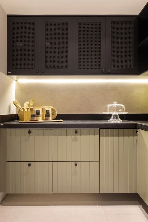 Luzes LED sob os armários superiores iluminam a bancada, e o uso de espelhos reflete a luz, criando a sensação de um espaço maior. Essa abordagem não só maximiza o espaço disponível, mas também garante um ambiente bem iluminado e funcional.