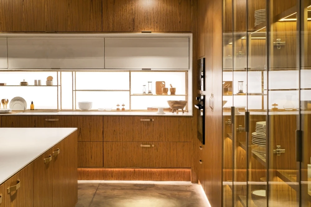 Por outro lado, as portas dos armários e os painéis frontais, que são mais visíveis e exigem um acabamento estético superior, podem ser produzidas em MDF. Isso permite uma personalização maior, com opções de pintura e revestimentos que se harmonizam com o design da cozinha.